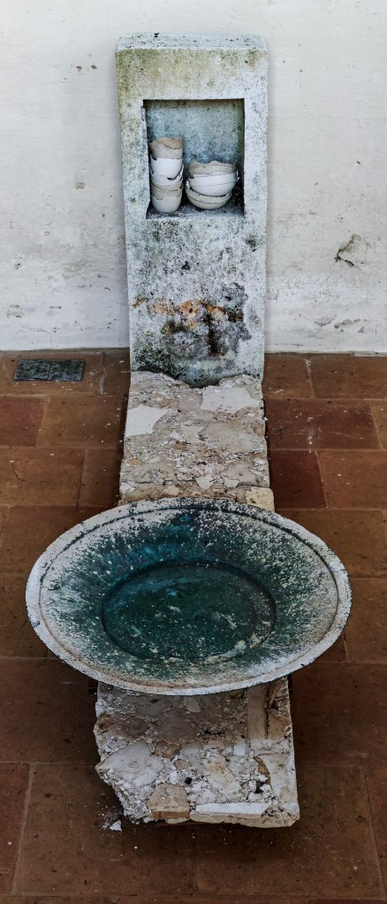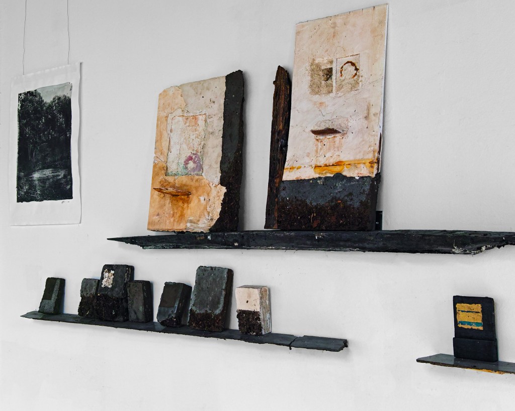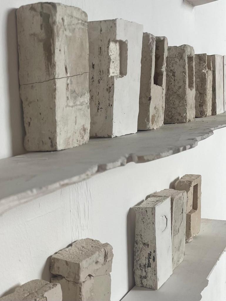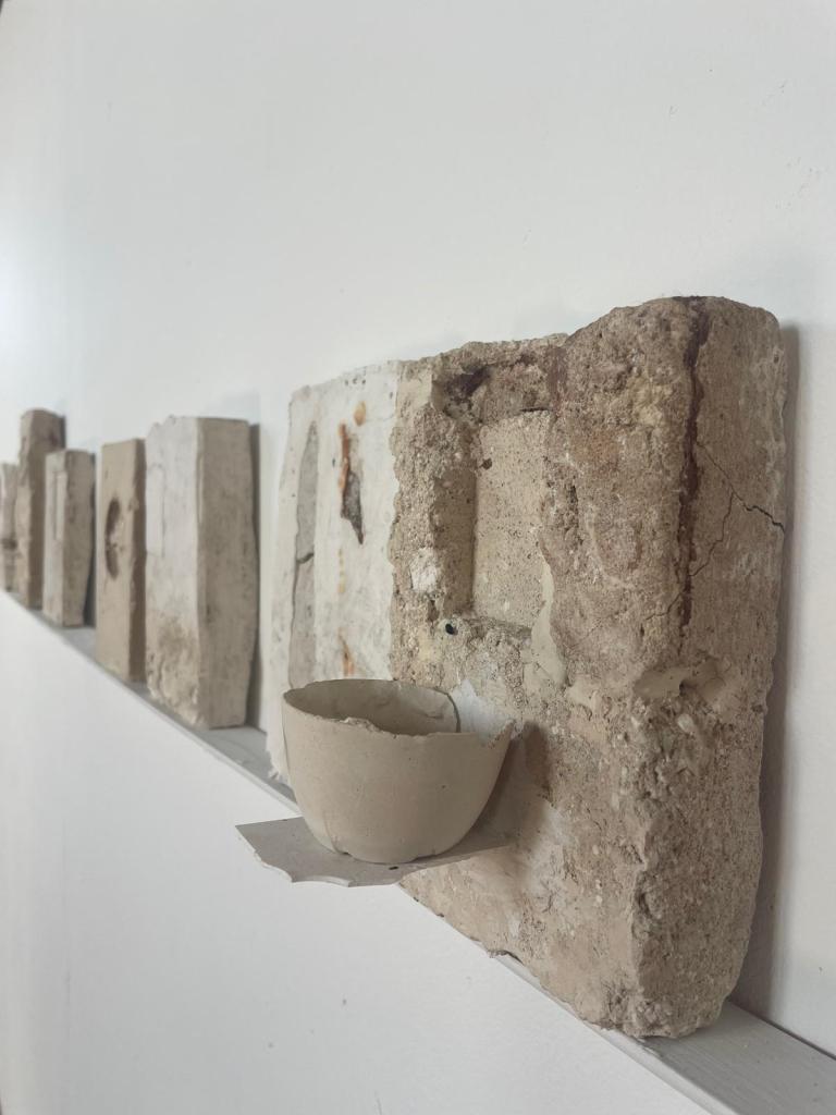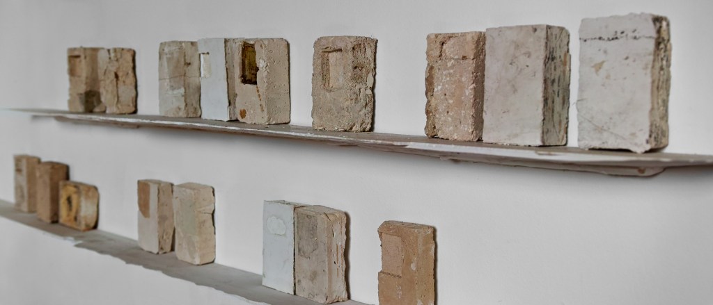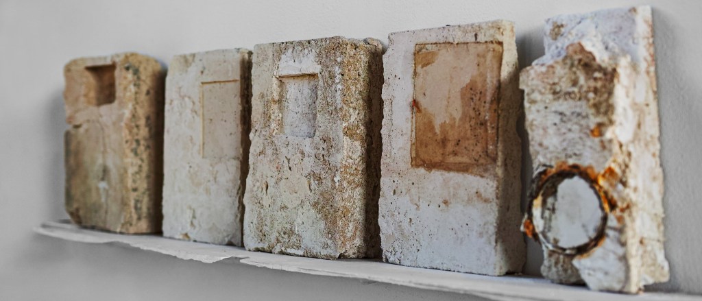 I responded to a commission to make a cross for St Agnes Church in Cawston. The brutality of her experience, the vulnerability of holding beliefs contrary to state power led me to dig a mould out of the earth in my garden. I wanted to connect with how persecuted people need to whisper and conceal their thoughts and beliefs or face the consequences , like Agnes. Once again, I felt that the imagery and ideas I was searching for already exists, close to hand. I thought about the generations of people who have come to Hall Road in search of the healing properties of spa water and medicinal leeching. Every day I walk up and down Hall Road. I began paying closer attention to the springs and spas and the leech pond that exist along the road. The practice of digging a cross out of the earth made me think about soil and how else I could use it. I felt that by using the earth around the leech pond and the water from the springs I could connect with the potential of the material to carry some of its historic purpose, to heal and restore. I started to fix the leech pond soil to the wall pieces, the human presence, embedded within the wall, being offered some balm, an opportunity to heal.