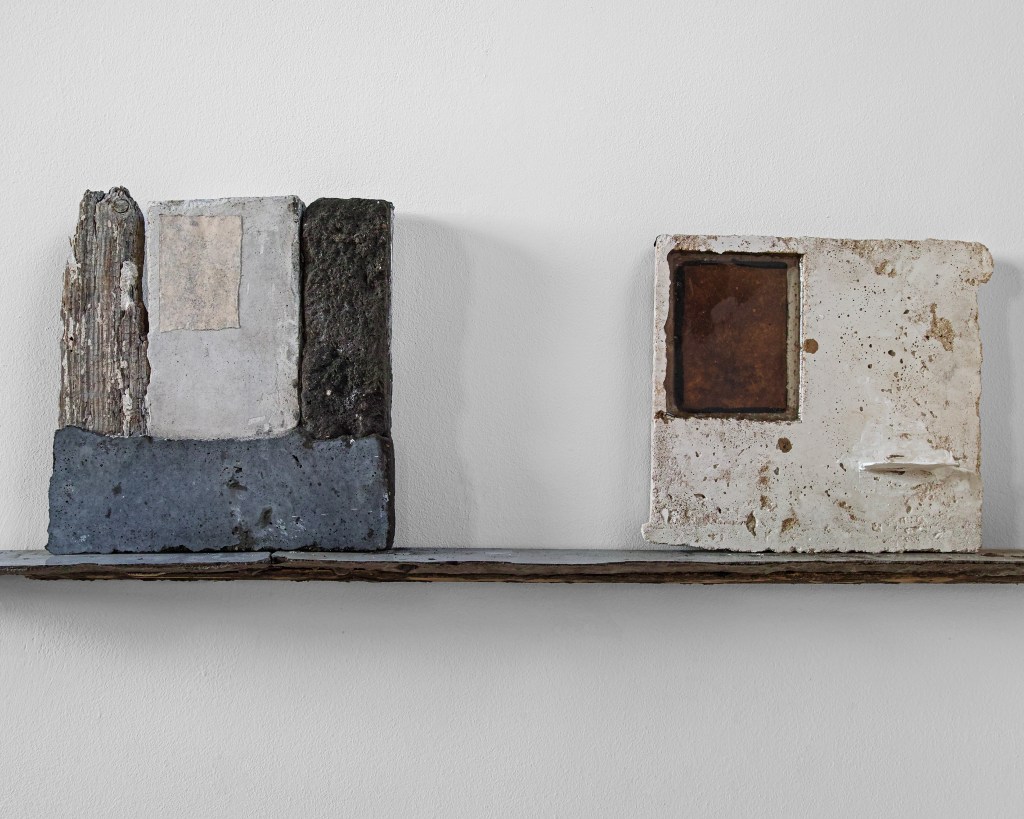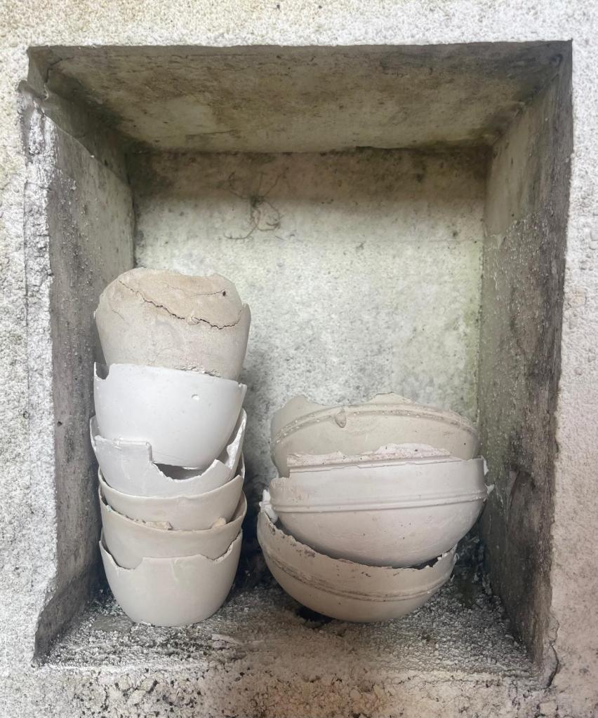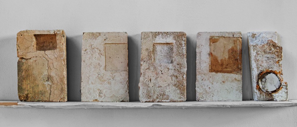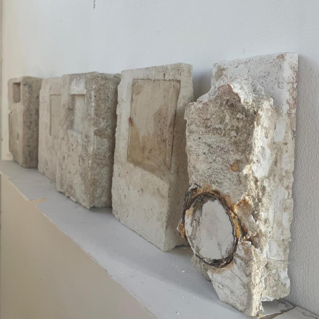 In 2021 I started making work for an exhibition in this church. I began to see a link between my practice and the walls of this church. For a decade or more I had been setting images and rusted metal into plaster blocks. These blocks had a similar material quality to the walls of the church. The wall painting was once part of something much larger, that larger part still exists but has been buried under layers of plaster and limewash. I thought that something else exists within these walls, a human presence, not visible, but present. Moisture from our speech, our hands and heads, carrying our DNA, circulating in currents and setting into the wall surface. I read a journal about Fetal microchimerism, the discovery that cells within a baby live on within the mother long after childbirth. Another instance of a human presence being embedded without it being visible. I wanted to work on this idea of human traces being present within material. Increasingly, I felt that the material was enough in itself to communicate this idea and that I no longer needed drawings or photographs.