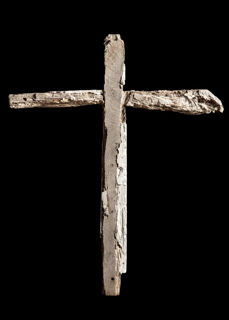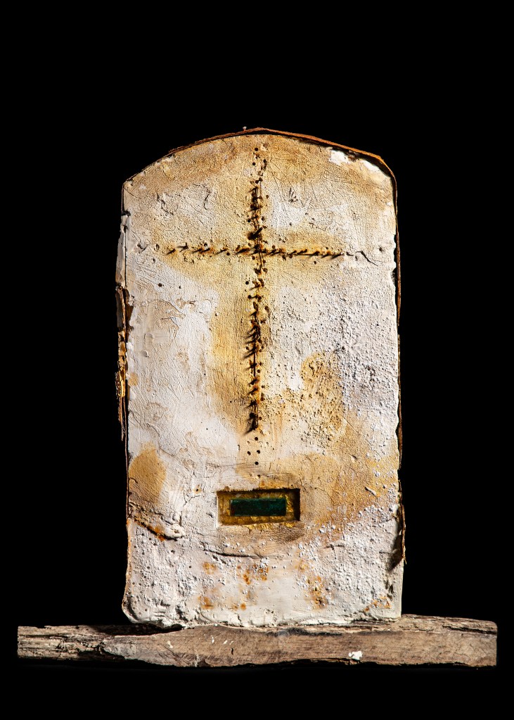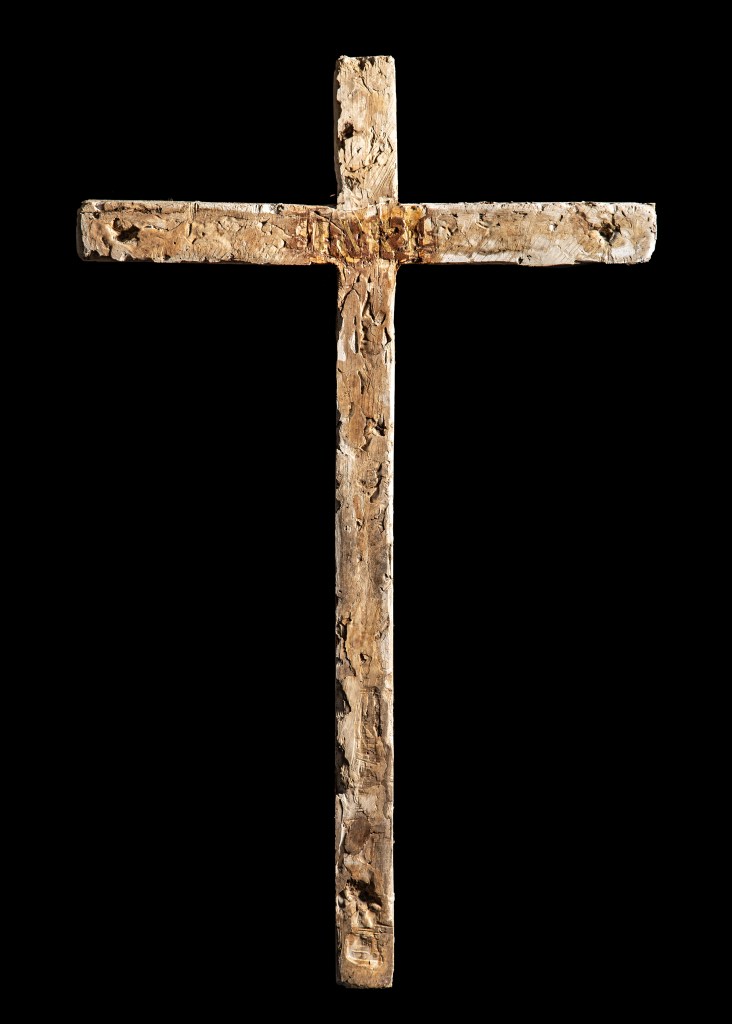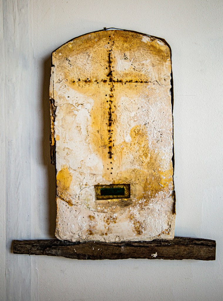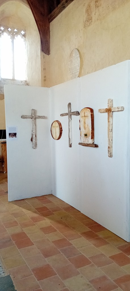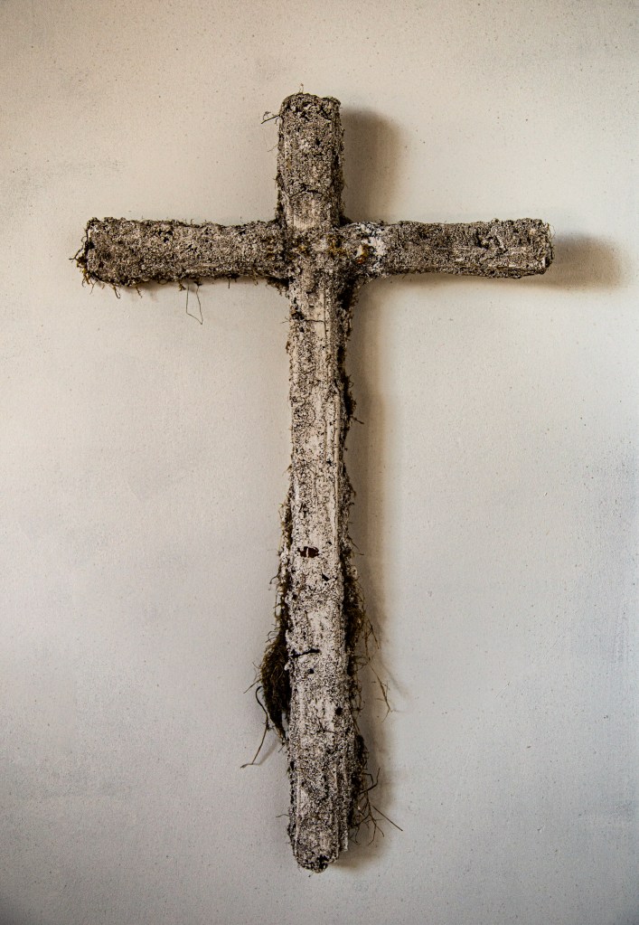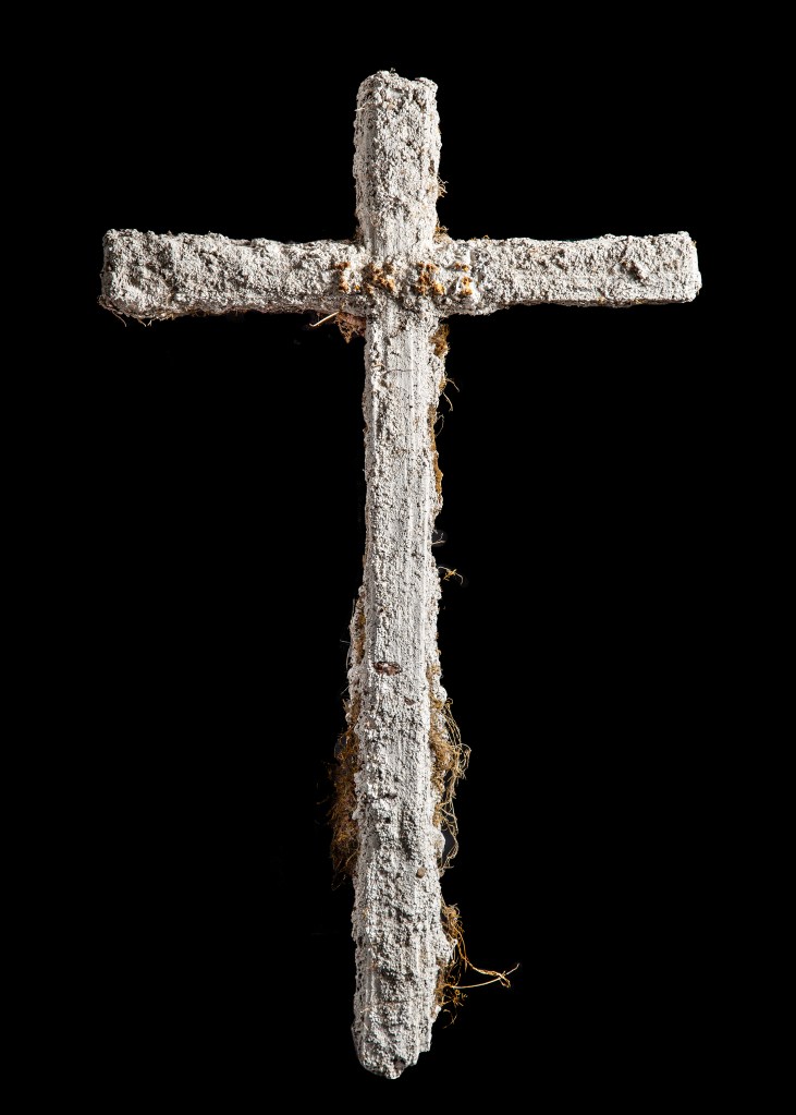 After my exhibition in this church in 2021 I started talking to the Reverend Andrew Whitehead about the possibility of making a cross for St Agnes Church in Cawston. On my first visit, my eyes were drawn to the remnants of red ochre paint on the nave wall. I felt that the transformative process of oxidisation that occurs to create red ochre pigment was the link I was looking for to use oxidised metal and plaster for this project. I was worried that any cross I made would intrude itself on the beauty and integrity of the space and interrupt that ancient impulse to commune with that part of ourselves that needs stillness and is in search of that connection with something beyond ourselves. I wanted the cross I made to reflect the brutality of St Agnes’ experience, the singularity of her faith, her vulnerability and bravery. I felt that the cross she may have carried would not have been bejewelled or varnished, it would have been trampled upon, broken and buried. I wanted the cross I made to reflect my thoughts about what a symbol of faith could look like when not aligned to state power. I wanted to explore how others, during this time of persecution, may have held onto their beliefs and symbols but in subterranean whispered tones. I therefore dug a cross out of the earth and used the earth as a mould for the plaster.